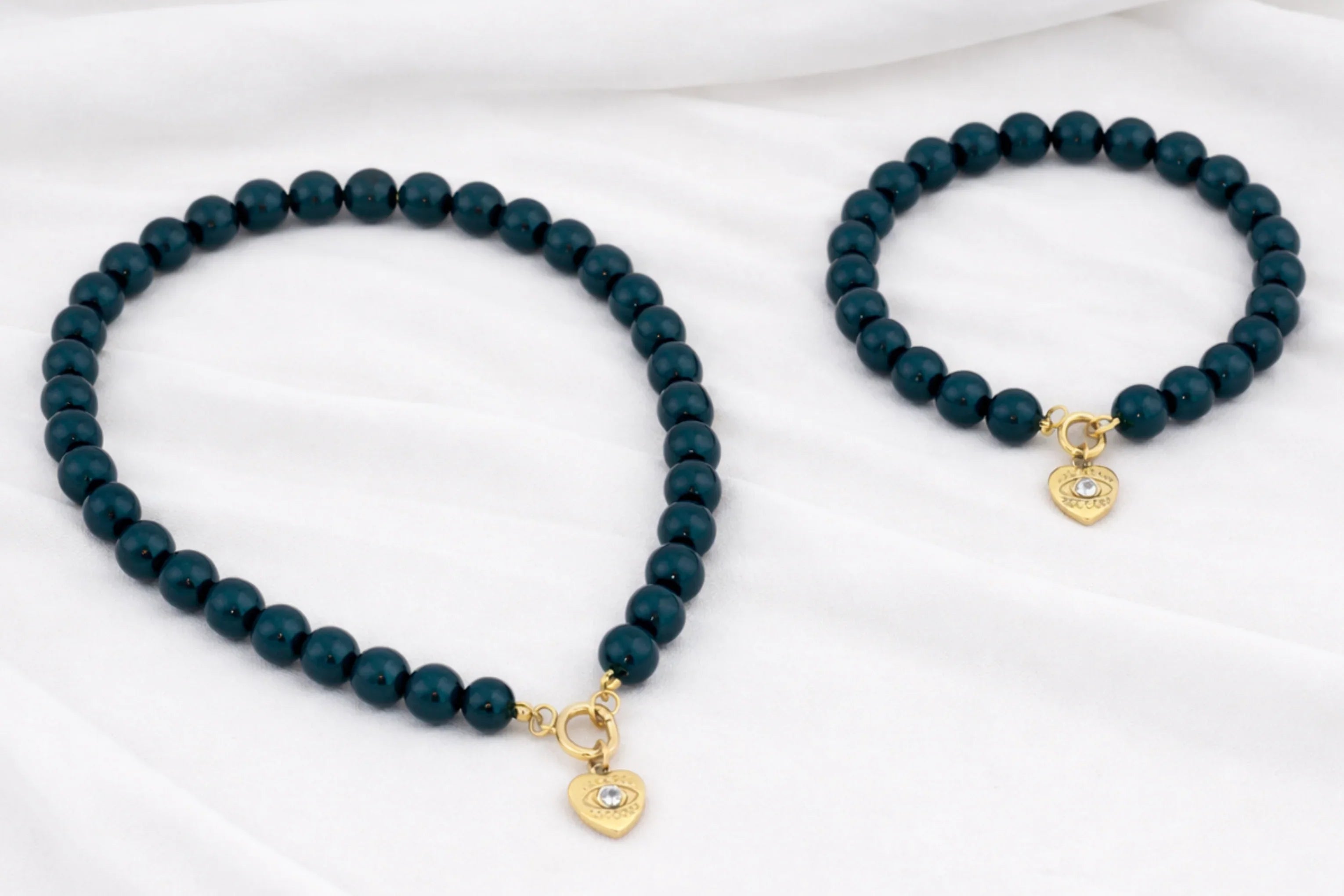 סט לארה מורכב מצמיד + שרשרת עם תליון לב בסגנון וינטג' בציפוי זהב או כסף לבחירתך