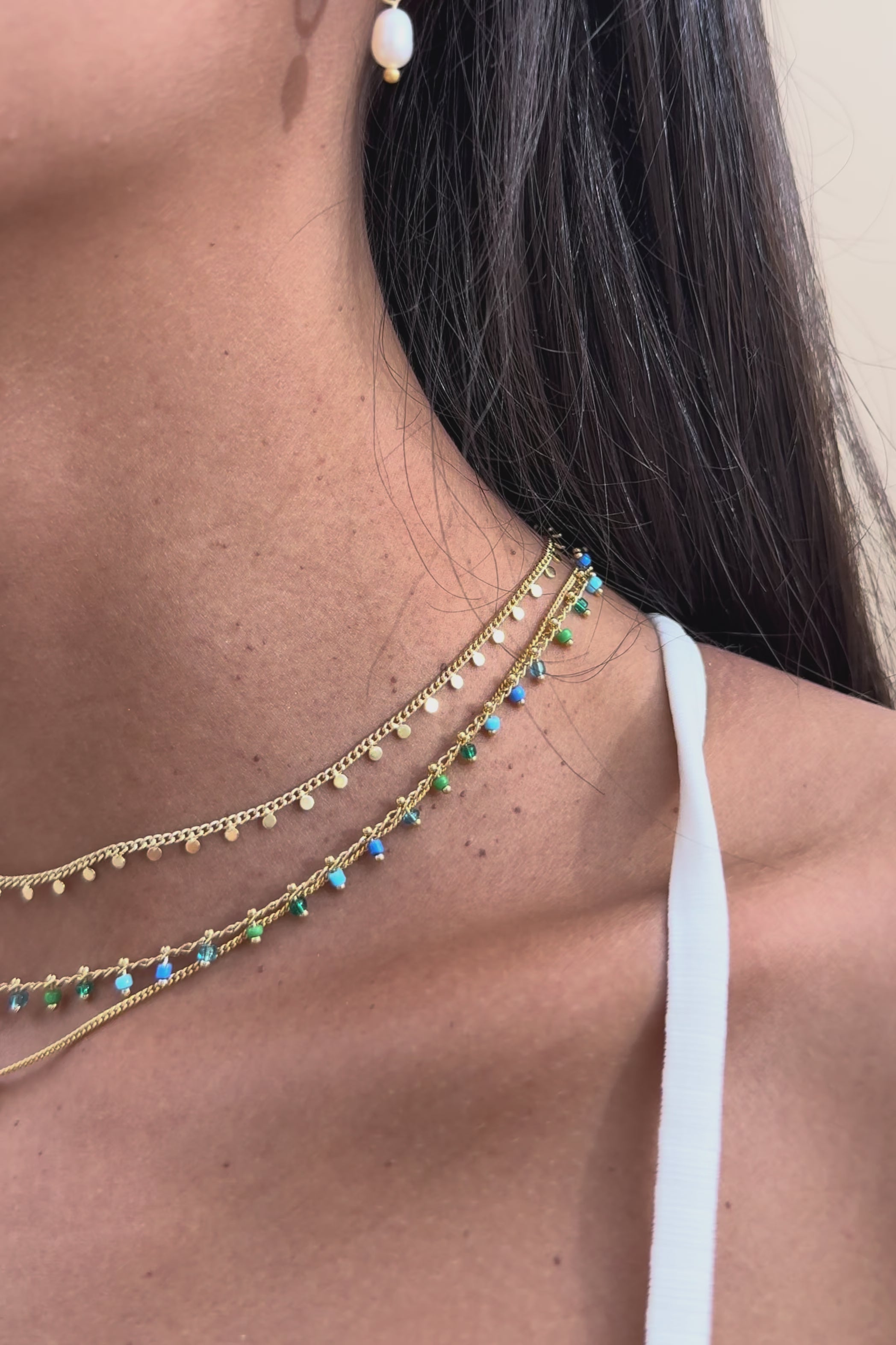 שרשרת אקווטיק היא לגמרי הבריחה הקטנה שלך למים הצלולים – שרשרת קצרה ועדינה עם חרוזי זכוכית בגווני כחול, ירוק וטורקיז שמזכירים לגונה טרופית מושלמת.
