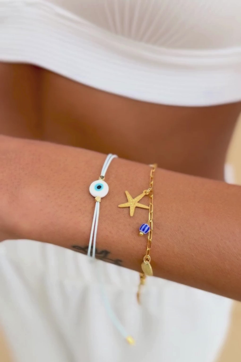 צמיד מאבי מביא איתו את הטאץ' הקטן שעושה את כל ההבדל – צמיד חוט עדין עם חרוז זכוכית נגד עין הרע במרכז, לשיק עם טוויסט ושמירה על אנרגיות טובות.